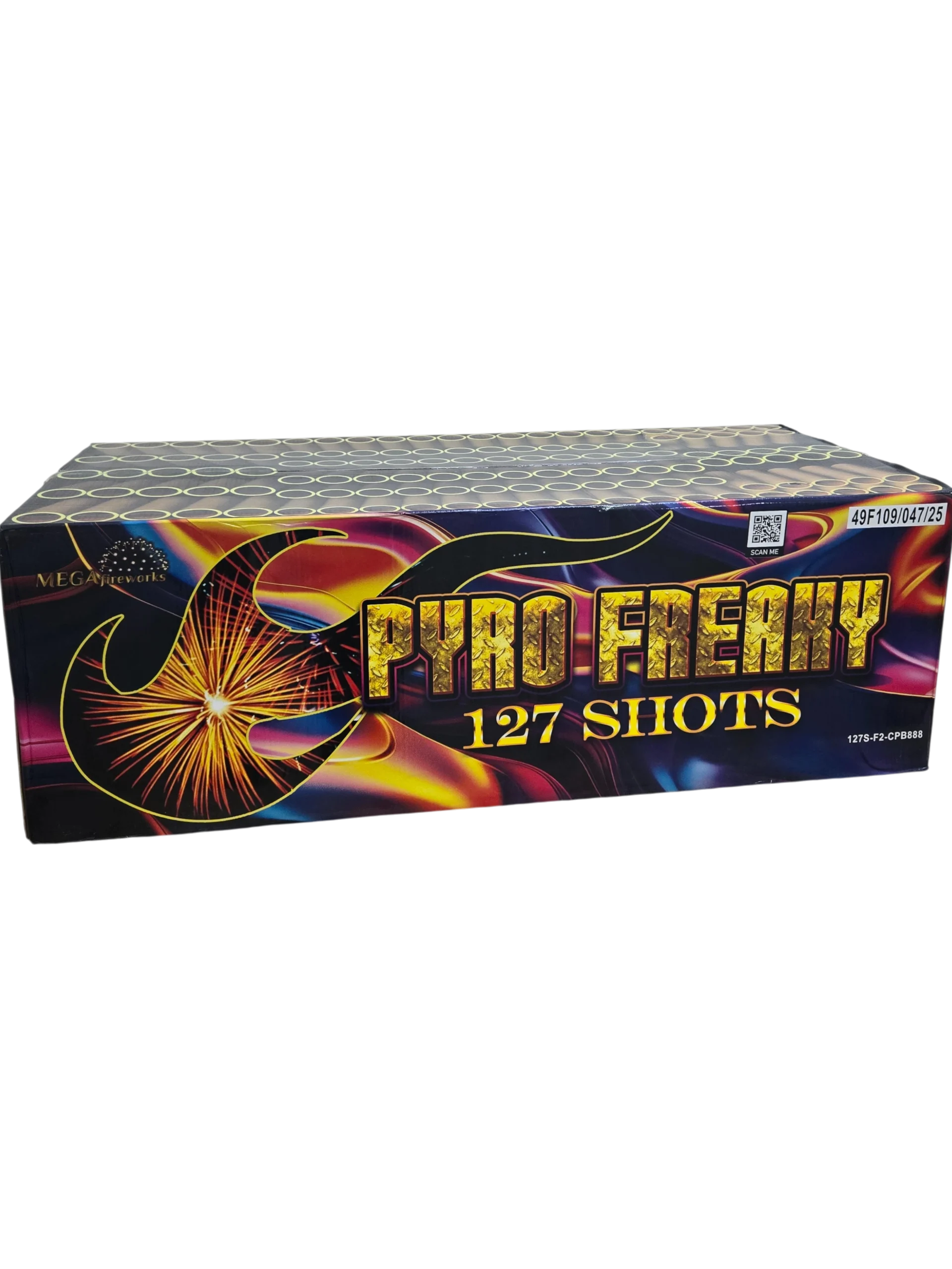 The Pyro Freaky 127SF2-CPB8 is a powerful compound fireworks cake designed for long and varied displays. With an impressive 127 shots fired from large-calibre tubes, this F2 category item combines multiple effects and firing angles in one integrated show.
