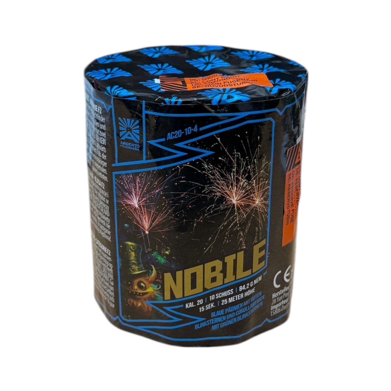 Com aproximadamente 84,2 g de NEC e um tempo de funcionamento de 15 segundos, o Nobile oferece uma precisão e simetria elegantes, típicas da engenharia europeia da Argento. Certificado na categoria CE F2, destina-se a ser utilizado no exterior em regiões onde é permitido o uso de fogos de artifício F2.